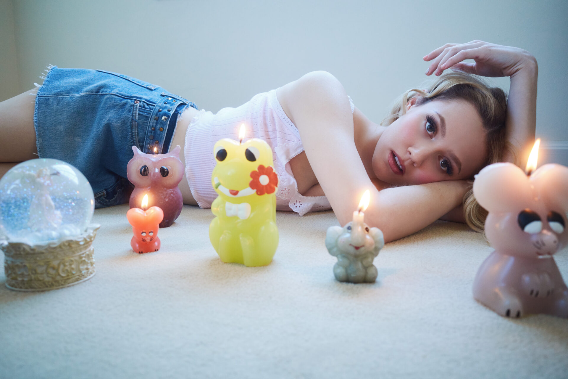 Puis elle s’allonge parmi les bougies animaux, mini-short, top tendre et étoiles au coin des yeux: une poupée chic qui prépare clairement une bêtise.
