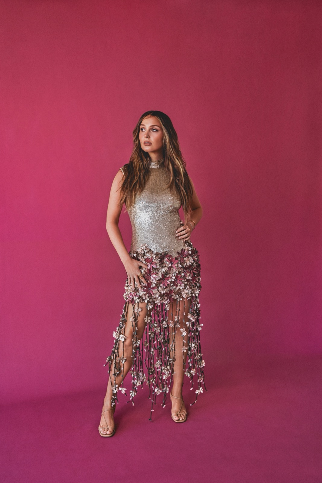 Pour COMPOSURE, elle passe du cuir noir au rose éclatant, avec ce calme intense qui donne l’impression que tout flotte autour d’elle.