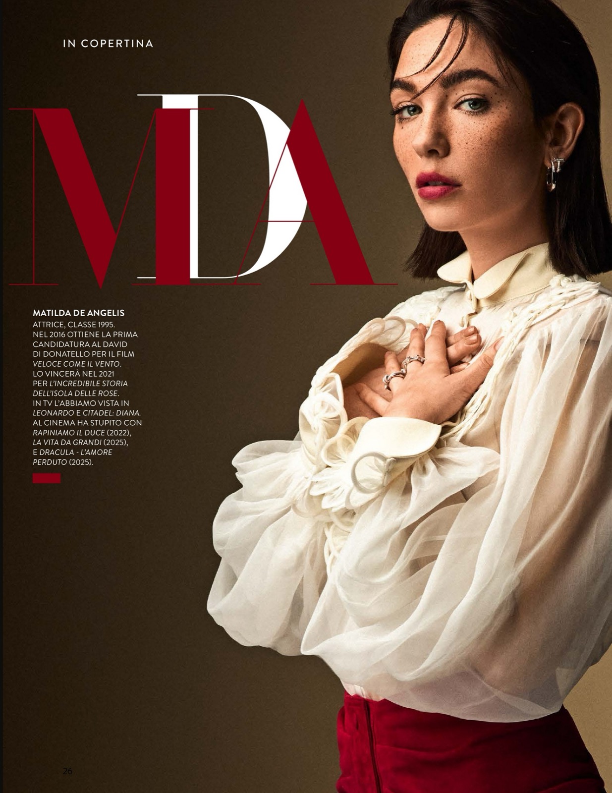 Pour F Magazine, Matilda De Angelis transforme le studio en théâtre feutré, entre couverture ciselée et pages mode au chic presque insolent.