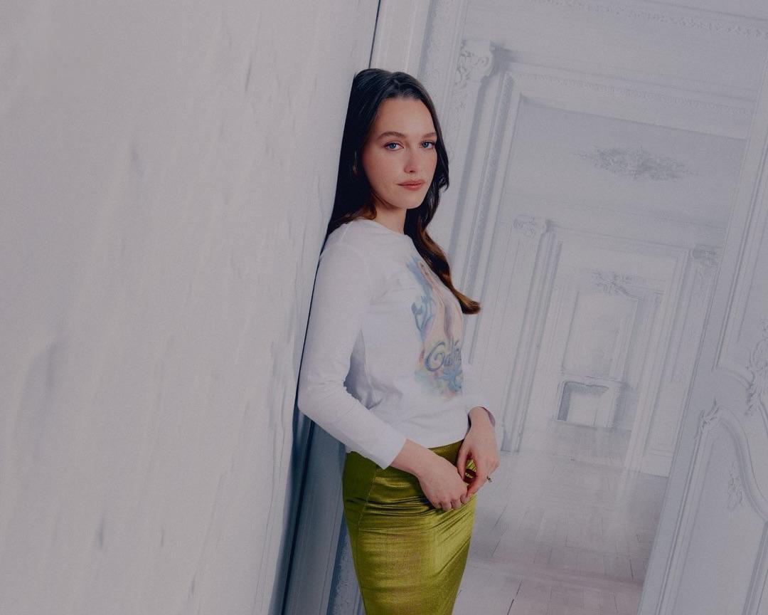 T-shirt immaculé, jupe satinée vert acide, cheveux lissés puis assouplis, regard clair posé sans empressement : tout murmure, mais rien ne s’efface vraiment.