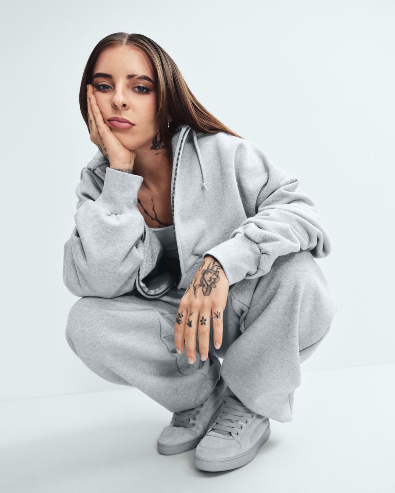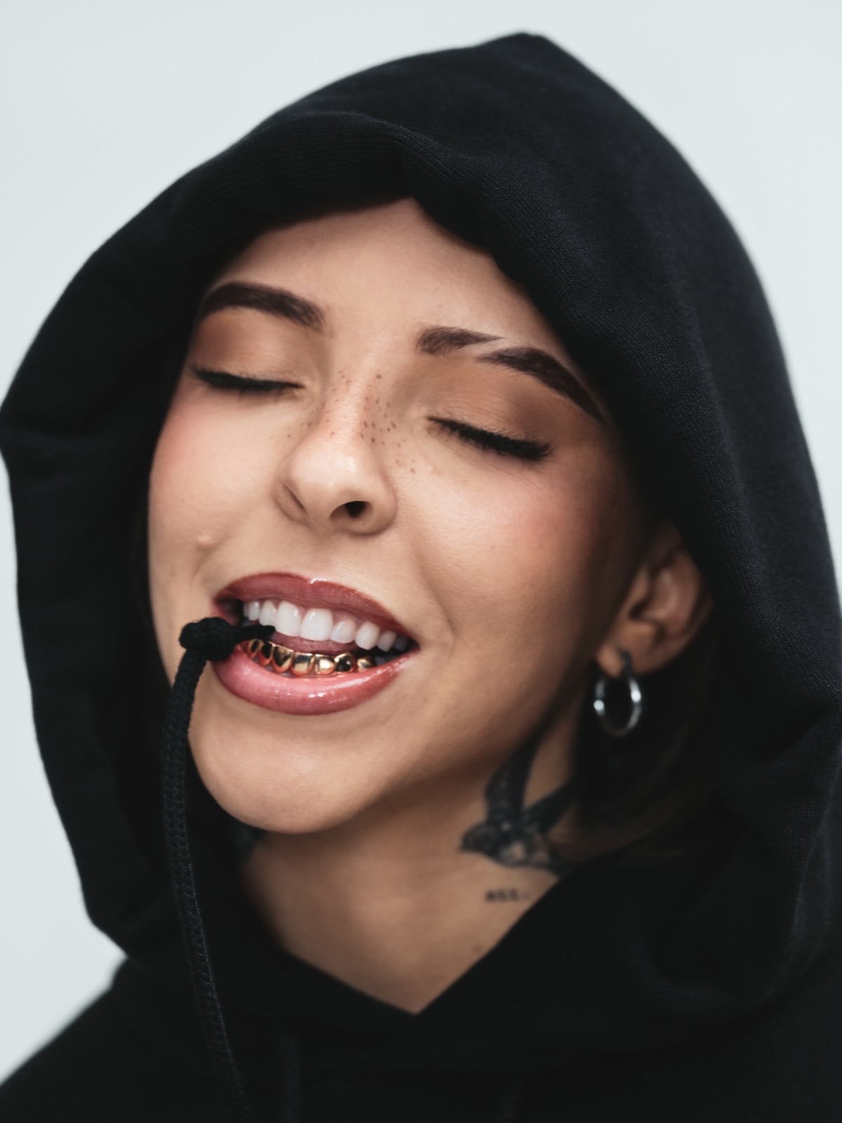 Le détail qui mord, c’est ce sweat tiré juste assez, ces tattoos qui coupent la douceur grise et ce sourire à grillz qui sabote toute idée de sage jogging.