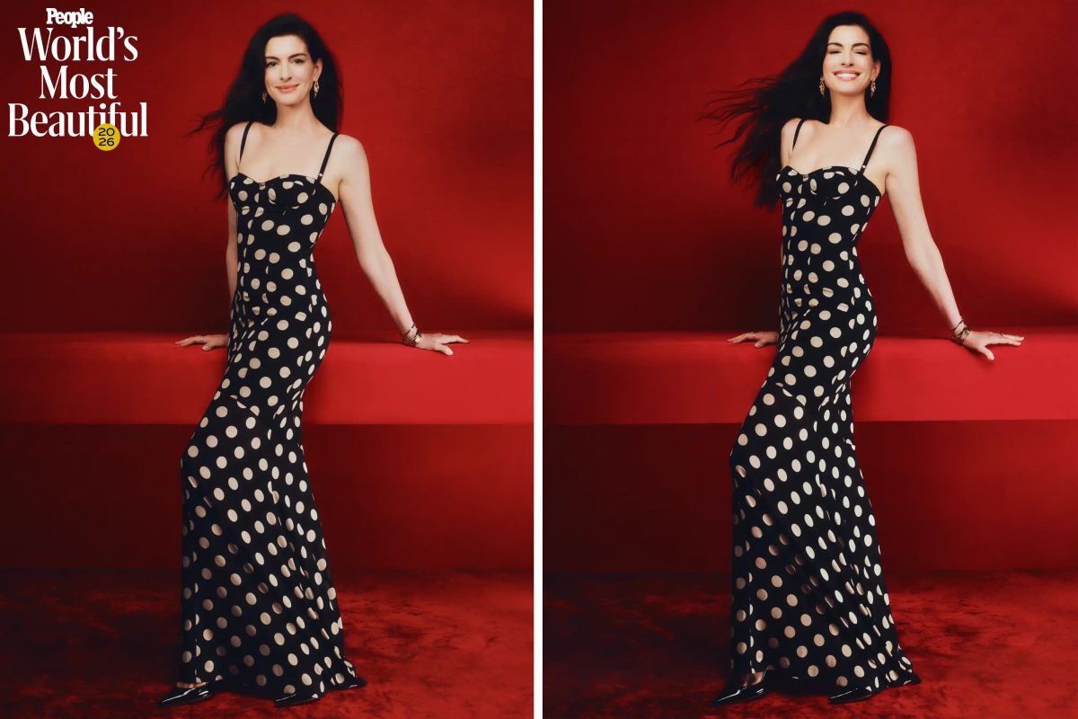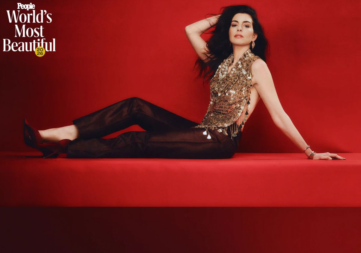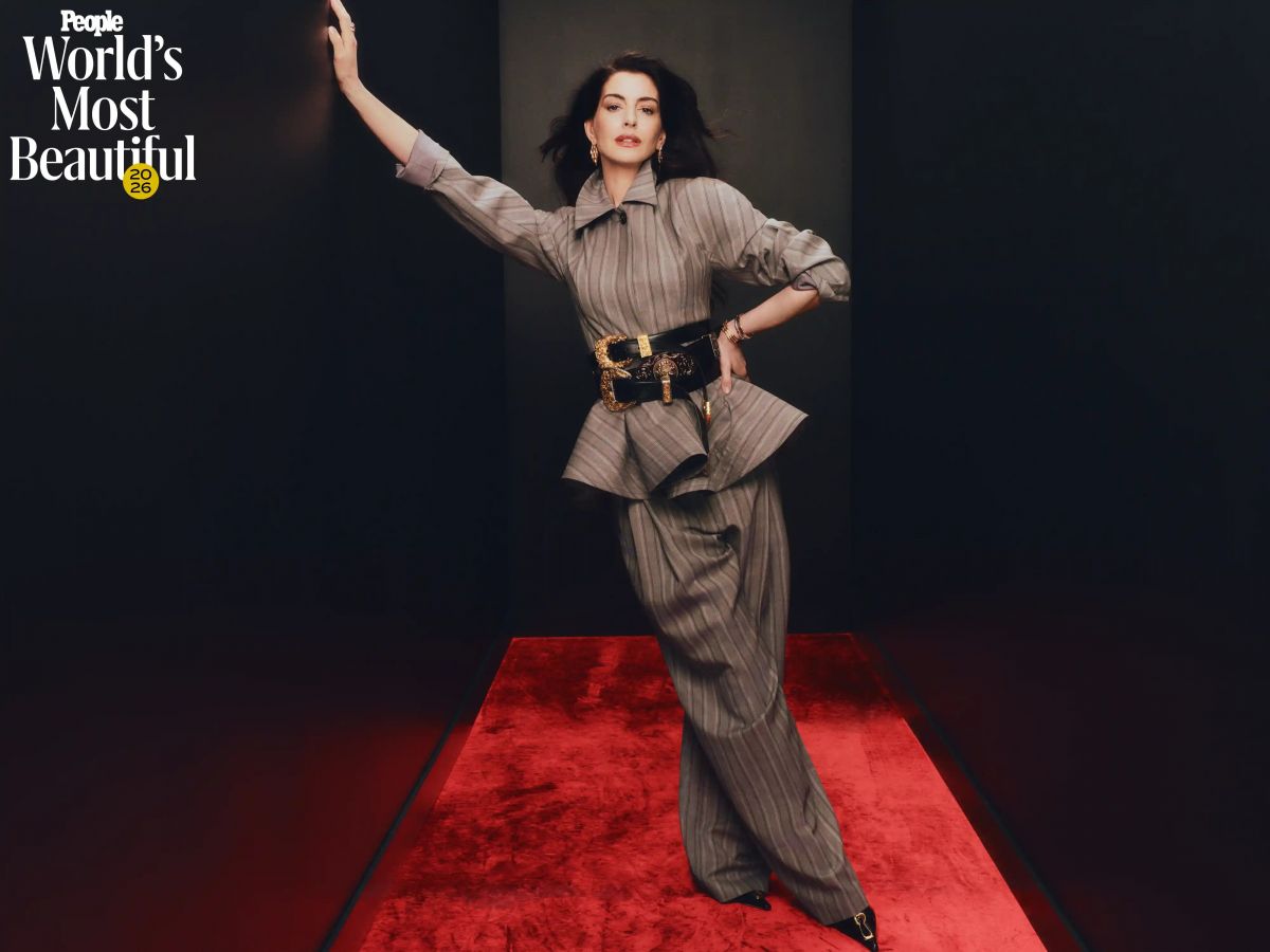 Pour sa séance magazine chez People, Anne Hathaway transforme le studio rouge en terrain conquis. Tout est net, chic, millimétré, avec cette aisance de première de la classe devenue impératrice.