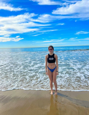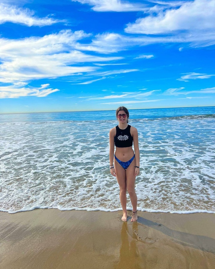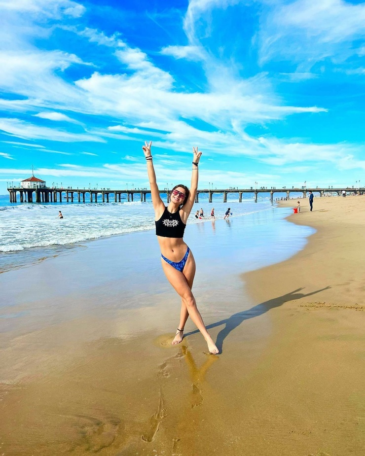 (10 photos)Elle marche, l’eau éclabousse, le bikini tient par miracle, et ce sourire dit clairement que la plage travaille pour elle sans contrat officiel app...