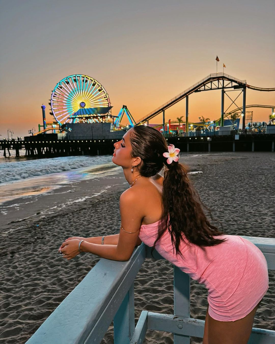 (4 photos)Armée d’un top fluide chocolat, d’un short blanc ultra-mini et d’accessoires dorés plus voyants qu’un panneau publicitaire sur Sunset Boulev...