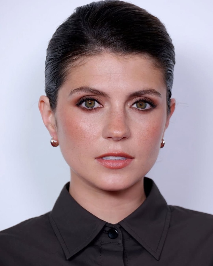 (9 photos)Devant l’objectif, elle pose droite comme une règle, sauf que la tenue tire ailleurs et que le regard, lui, fait clairement exprès.