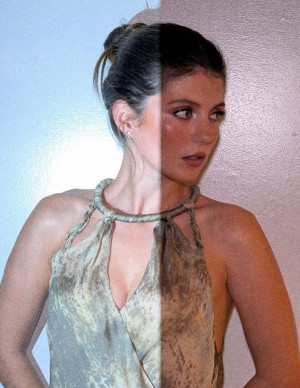 (9 photos)Sous l’eau, robe collée, elle ferme les yeux, respire, et transforme une simple page mode en défi mouillé, regard calme, tension bien installée.