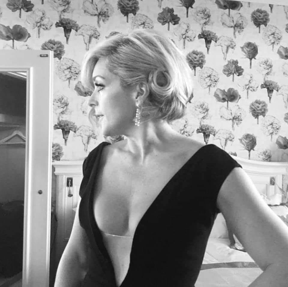 Jane Krakowski pose comme si l’hôtel lui appartenait déjà, entre lit défait, fauteuils empilés et regard qui juge la moquette.