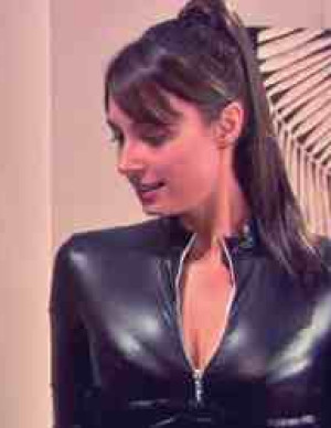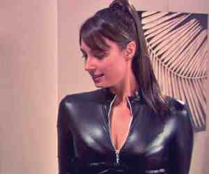 (6 photos)Sa robe latex rouge brille tellement qu’on dirait qu’elle vient d’être déballée comme un cadeau trop impatient.