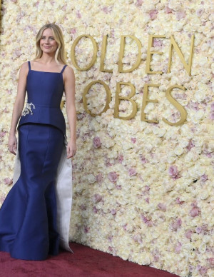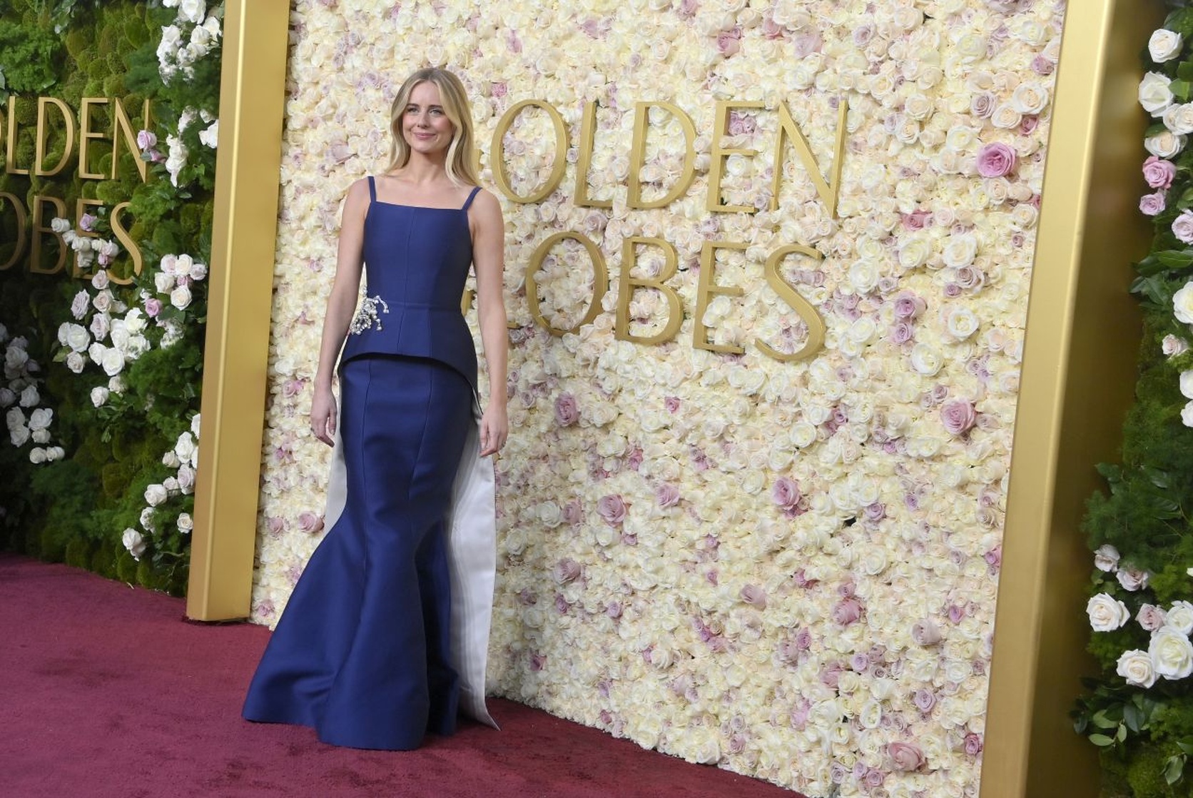 (12 photos)Sa robe dorée brille tellement qu’on dirait qu’elle essaie d’éclipser le logo géant derrière elle.