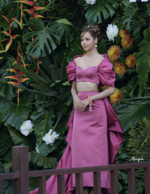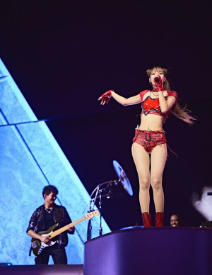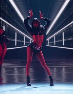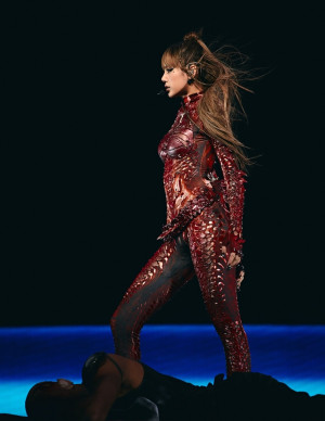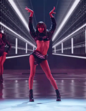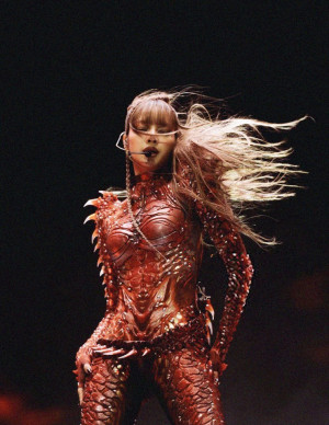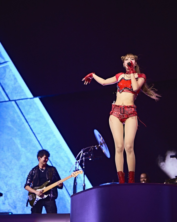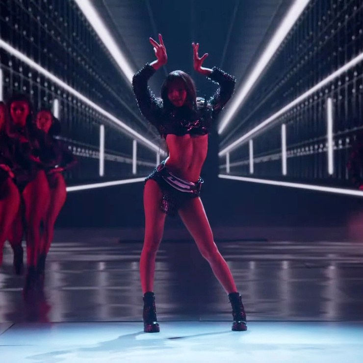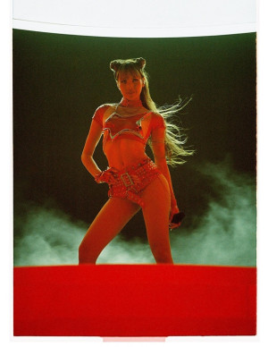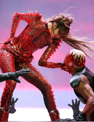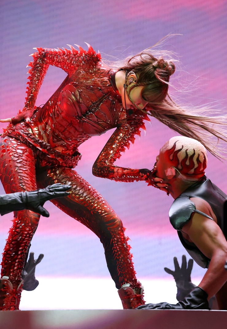 Dans une tenue rouge qui hurle j’ai pillé un dragon pour ce look, elle danse comme si elle voulait réveiller Godzilla.