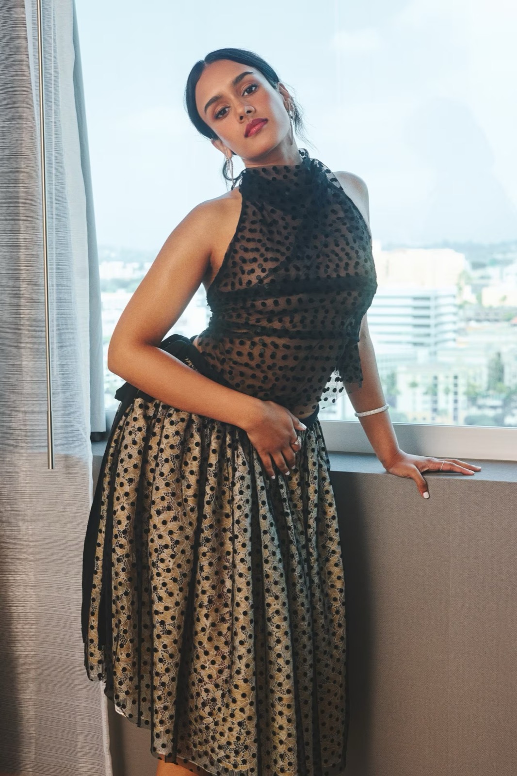 (9 photos)Devant l’objectif, elle pose droite comme une règle, sauf que la tenue tire ailleurs et que le regard, lui, fait clairement exprès.