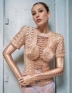 (4 photos)Son mini-corset blanc brille tellement qu’on dirait qu’il cherche lui-même un contrat avec le magazine.